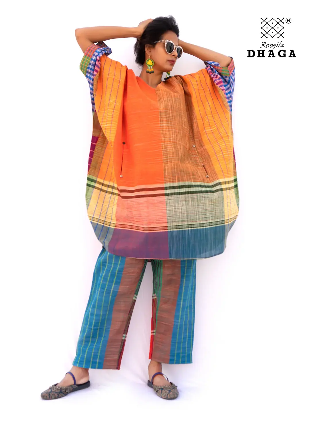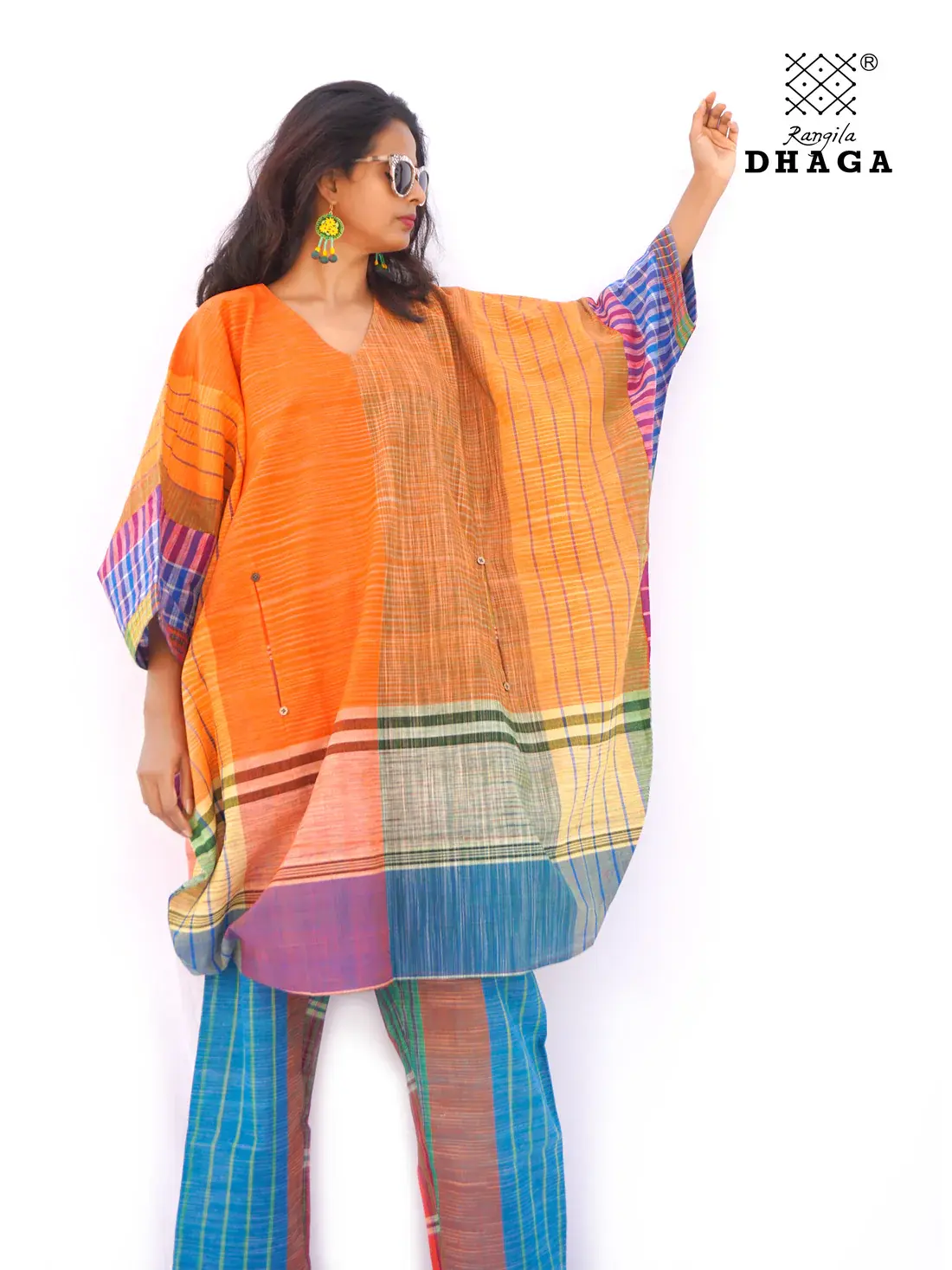 Introducing the epitome of elegance and sustainability, the Rangila Dhaga Ethereal Gamcha Handloom Sustainable Kaftan Dress. This exceptional piece seamlessly marries the rich heritage of handloom craftsmanship with the vibrant allure of gamcha fashion, making it a standout addition to any wardrobe. Crafted with meticulous attention to detail, each shrug is a celebration of traditional artistry and contemporary sensibility.