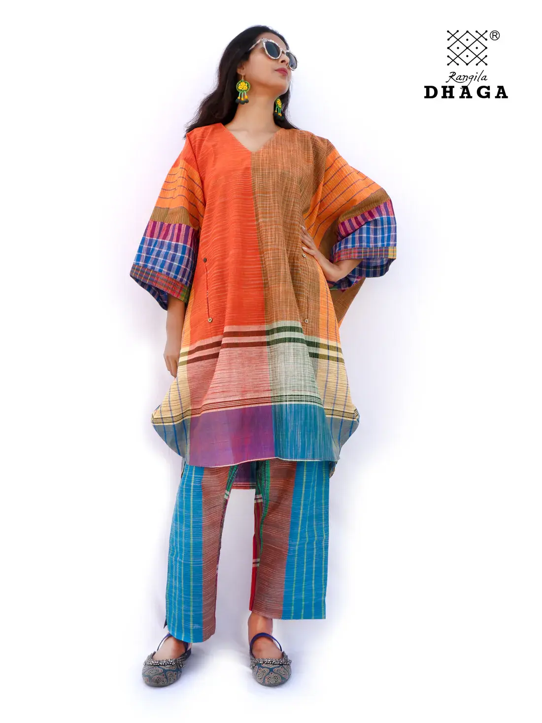 Introducing the epitome of elegance and sustainability, the Rangila Dhaga Ethereal Gamcha Handloom Sustainable Kaftan Dress. This exceptional piece seamlessly marries the rich heritage of handloom craftsmanship with the vibrant allure of gamcha fashion, making it a standout addition to any wardrobe. Crafted with meticulous attention to detail, each shrug is a celebration of traditional artistry and contemporary sensibility.